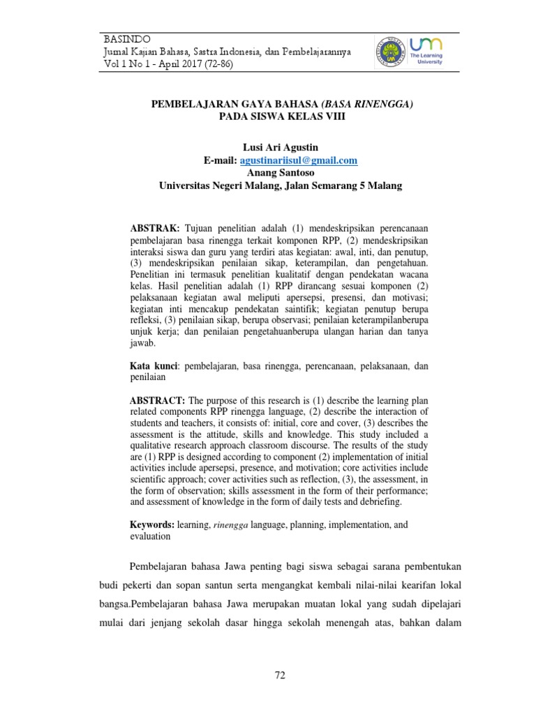 Yaiku wangun geguritan kang tinulis ora ngebaki larik lan ora kudu kawiwitan aksara gedhe (huruf kapital), sarta ora dipungkasi tandha titik (.) utawa tandha pawacan liyane. Guru dan siswa menganalisis struktur lahir dan batin dari teks geguritan yang telah disajikan 5. Apa saja struktur teks pidato brainly co id. Jenis teks geguritan yang pertama adalah teks geguritan yang menceritakan tentang kondisi atau pengalaman si pembuat geguritan maupun orang lain (naratif). Basa rinengga sumantri ngenger tugas sekolahku. Teks geguritan mempunyai 3 (tiga) jenis. Panjang dan pendeknya isi dalam geguritan pasti memiliki tema. Utawa b asa rinengga yaiku karangan kang kalebu susastra rinacik mawa basa kang endah. Proceeding seminar nasional rufi i adibuana. Pertama, teks geguritan yang menceritakan tentang pengalaman yang pernah dialami si pembuat geguritan atau orang lain, bersifat naratif. Contoh pidato ora resmi bahasa jawa contoh soal dan materi pelajaran 3. Guru menampilkan teks geguritan b. Struktur sesorah bahasa jawa terbaik kumpulan referensi cute766.